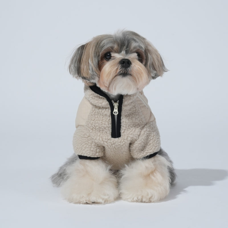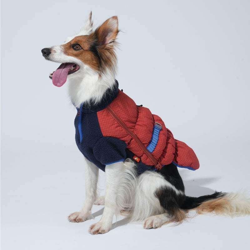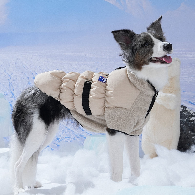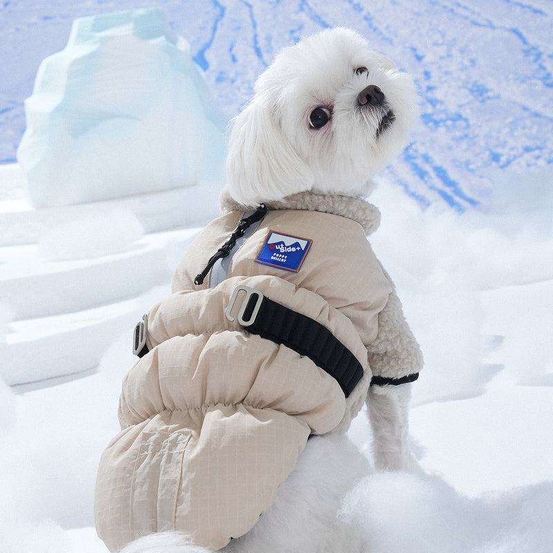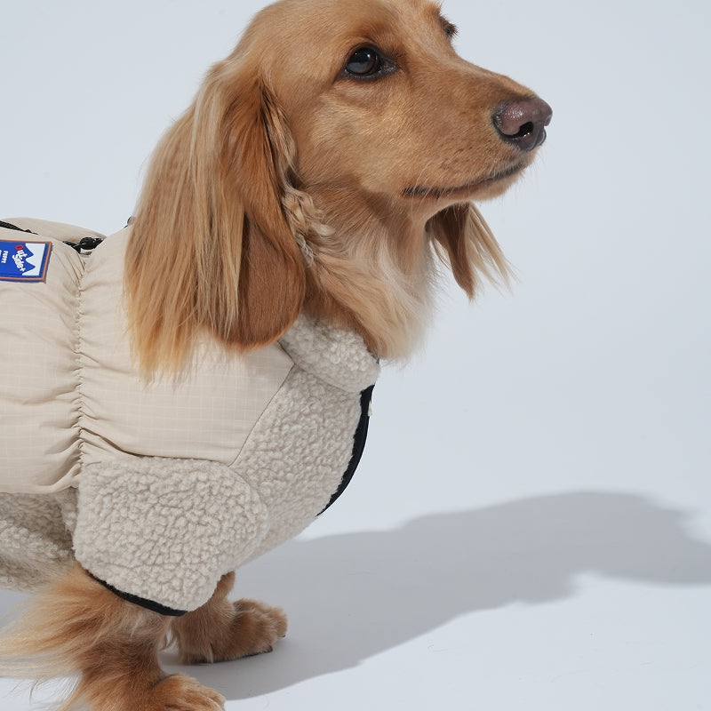 In the cold winter, both owner and dog need warmth. The Ice Field Color Block Padding is a sophisticated winter outer layer that mixes functional ripstop material with soft fleece fabric. It uses a lightweight "Wellon" filling and a heat-generating thermal lining. With its short sleeve design, this padding guarantees both your pet's comfortable activity and their cuteness.